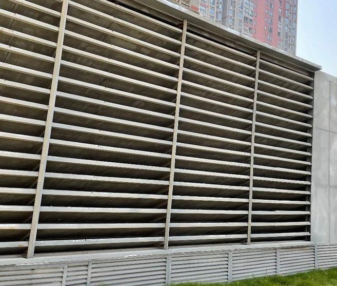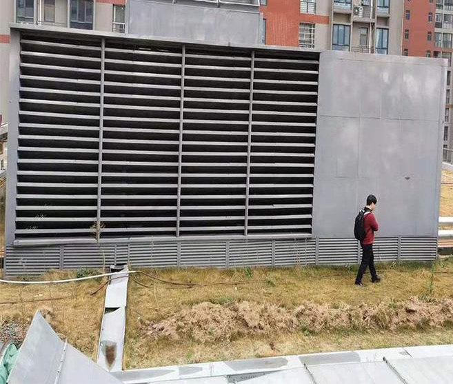 3、進氣消聲??照{外機進氣也是降噪的重點之一。由于空調機組設備較大,排氣量與進氣量都是非常巨大的,但是空調設備的壓縮機產生的噪聲值也是非常的高,既要保證降噪效果又要保證進氣,所以使用進氣斜插式消聲百葉和進氣企口。