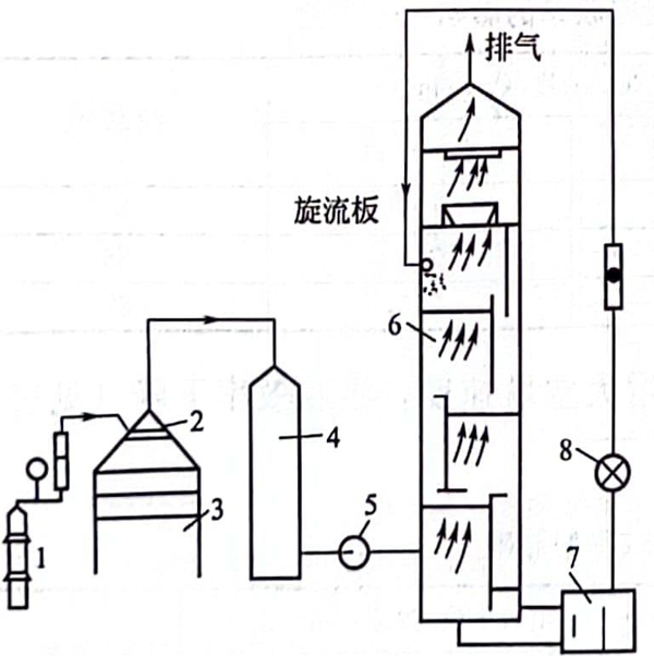 1-液氨鋼瓶;2-氨分布器;3一通風柜;4-緩沖瓶;5-風機;6-吸收塔;7一堿液循環槽;8-堿泵