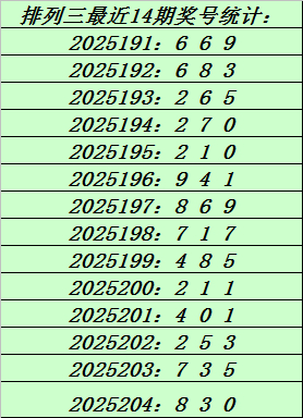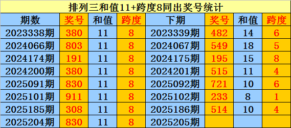 上期回顾:排列三第2025204期奖号:830。和值11,跨度8。