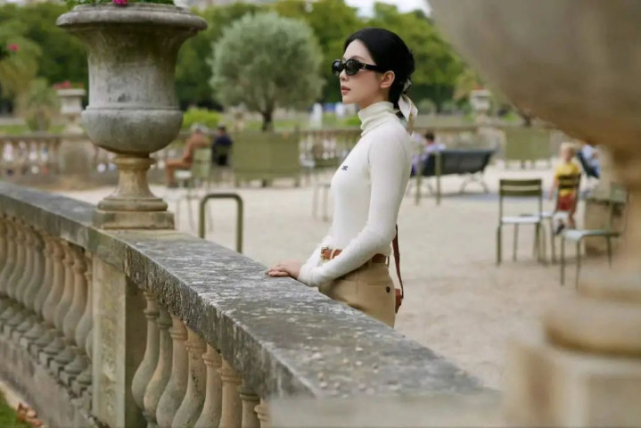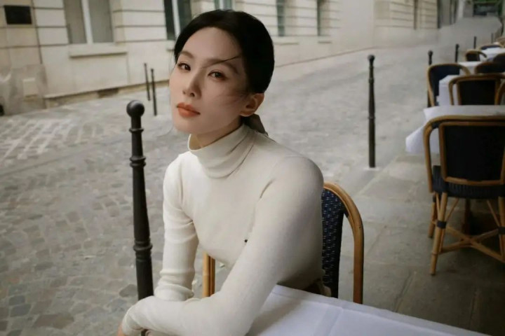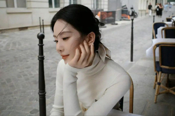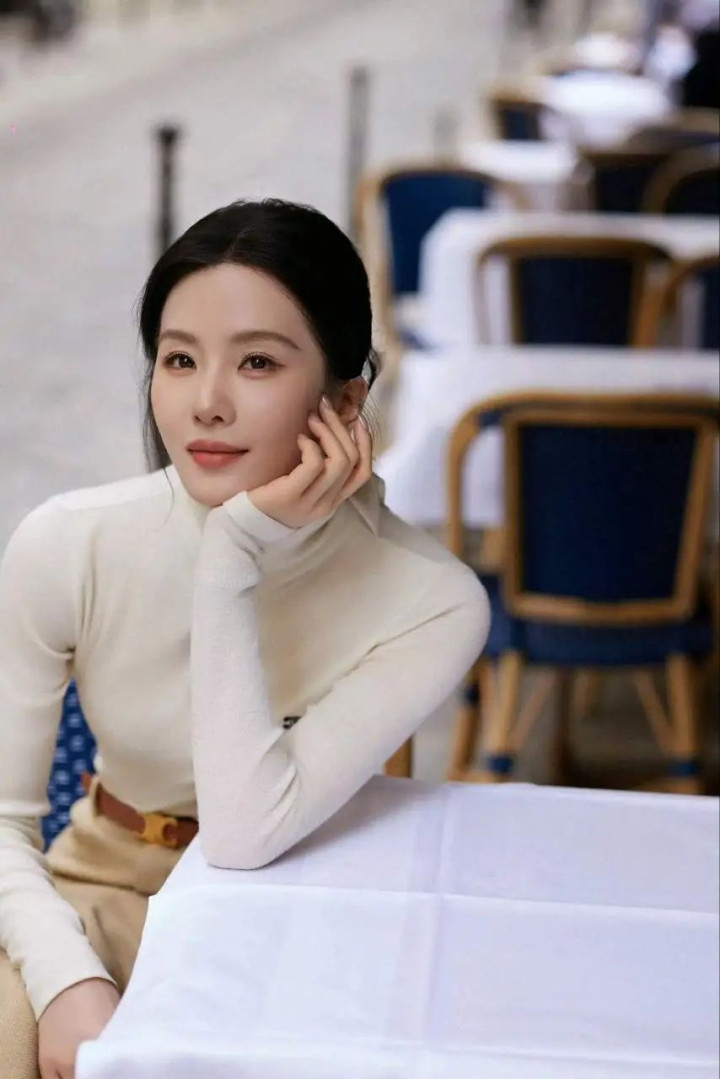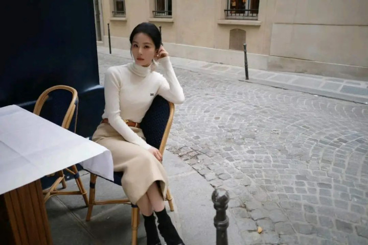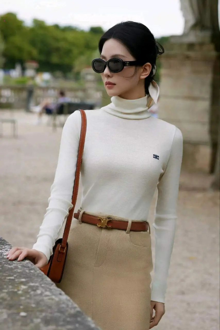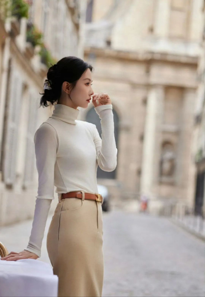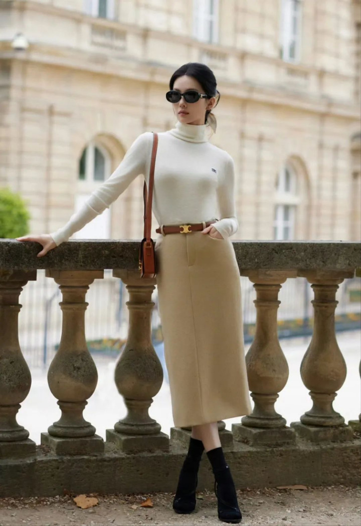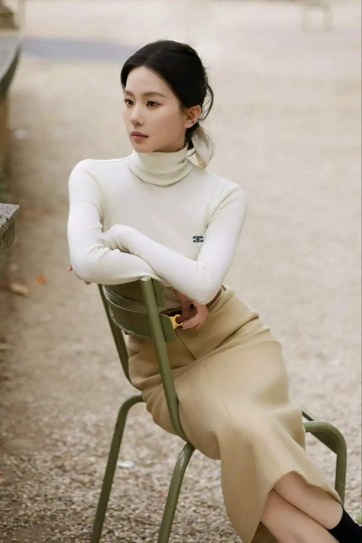 象牙白高领针织衫,搭配卡其色半身裙,丝巾扎发,全身满满的法式优雅。整套衣服在她身上,被她诠释了“法式浪漫和东方古典”的完美结合。